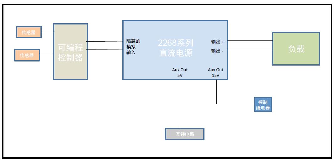 使用2268系列直流電源作為控制系統的一部分。模擬控制信號可以對電源輸出進行編程。除了驅動負載,該電源的兩個輔助輸出還可以驅動外部器件或電路。輔助輸出可以省去對測試系統中外部功率源的需求。