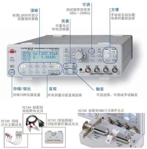 儀器標配以下兩種測試夾具:HZ188四端SMD貼裝器件測試夾具和HZ184容易夾持分離器件的開爾文夾測試線;此外,選配HZ181測量穿孔器件的測試夾具、HZ186測量變壓器的測試線。儀器選配HO118組件屜接口,提供8個開路收集器輸出,根據相應的誤差窗口進行獨立器件篩選。