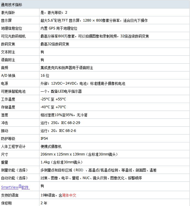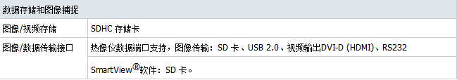 ? 方便的圖像傳輸協(xié)議,熱像儀數(shù)據(jù)端口:圖像傳輸為SD卡、USB2.0、視頻輸出DVI-D(HDMI)、RS232。SmartView?軟件:SD 卡;