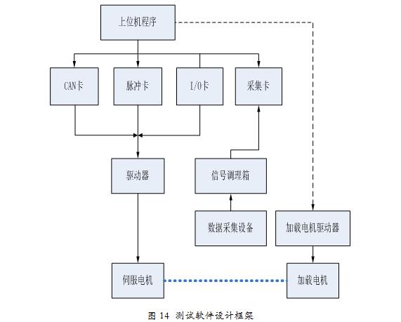 上位機(jī)程序通過CAN卡、脈沖卡、I/O卡向伺服控制器發(fā)送控制指令,使被測控制器響應(yīng)。加載電機(jī)驅(qū)動器接收上位機(jī)指令,進(jìn)行加載動作。轉(zhuǎn)矩、轉(zhuǎn)速、角度等參數(shù)通過數(shù)據(jù)采集設(shè)備上傳至上位機(jī)程序,進(jìn)行處理和保存等相關(guān)動作。
