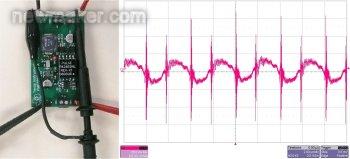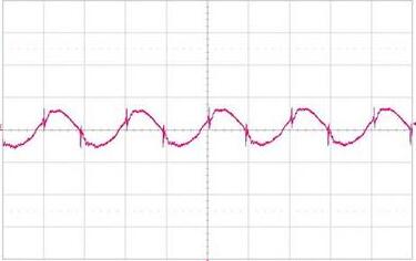 此外,把示波器引線繞在鐵芯上可減小這個電流,因為這樣會形成一個不影響差分電壓測量、但可降低由共模電流產生的測量誤差的共模電感。圖4顯示了采用改進測量技術對同一電路得到的紋波電壓測量結果。可以看到,高頻尖刺雜散干擾已幾乎消除。