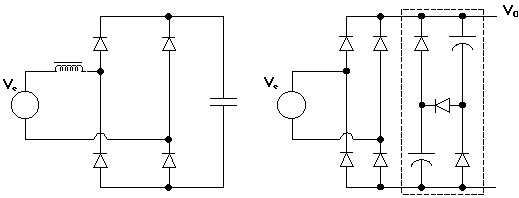 實際上,對于整流性負載的電子、計算機產品,為提高功率因素,采用無源PFC及有源PFC兩種方式。 無源PFC使用電感器(如圖2)、電容器(如圖3)所組成的網絡來降低諧波電流,因電源頻率為50或60HZ的低頻,故需體積不小的電感與電容器,另外功率因素提升的效果較差,改良的成果較有限,因此很少采用。圖2輸入端的電感工作頻率為電源頻率(50/60Hz),因為電感可以抑制電流的突變,所以輸入電流的波形會比較平滑。圖3則是利用部份平坦的電路架構,來改善功率因素,其原理,是延長電源電壓大于輸出電壓的范圍,根據二極管導通的條件,輸入電流的波形將變的較平坦。