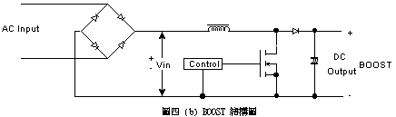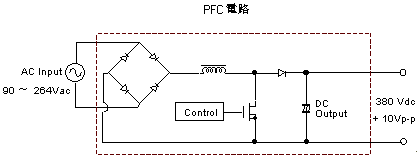 有源PFC采用有源元件(控制電路及功率半導體開關),如圖4所示。其基本工作原理是調整輸入電流波形與其輸入電壓波形相同,以便達到功率因素為1,目前許多廠商提供PFC控制IC,僅要外加功率晶體管、電感器等少數外部零件,便可組成一個有源式功率因素調整器,如圖4(b)BOOST結構功率因素調整器為升壓型,即輸入電壓范圍從90Vdc到264V,不需要另外開關切換選擇范圍,這是功率因素調整器一項重要附加價值,而功率因素調整器輸出約為380Vdc內含10Vp-p(50/60HZ紋波及高頻噪聲)的信號。