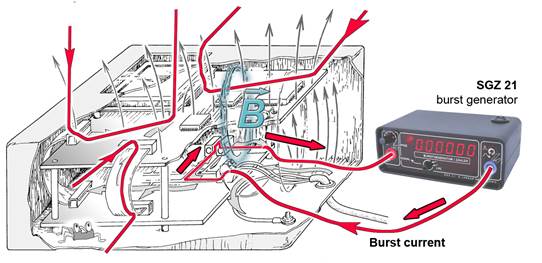 圖1:采用SGZ21脈沖率發(fā)生器受到干擾的電子模塊的選擇干擾電流路徑