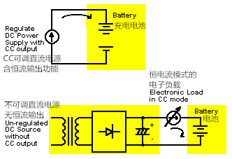 使用電子負載可測試充電電池的充電特性。此時使用具有定電壓和定電流(CV/CC)功能的可編程直流電源,通過電源的恒流(CC)功能,用已設定的恒定電流來對充電電池充電,同時有的電源具有回讀功能,在恒流充電的情況下,同步測出充電電壓和電池充足時的電壓與功率,例如HMC8043可編程電源;如果沒有可編程直流電源,可使用沒有穩壓限流功能的線性直流電源(例如簡單整流與電容器濾波電路,例如:HM7042-5)與直流電子負載串聯,用做為電流源對電池充電,此時電池的充電電流,由電子負載在定電流模式下的設定電流所控制。