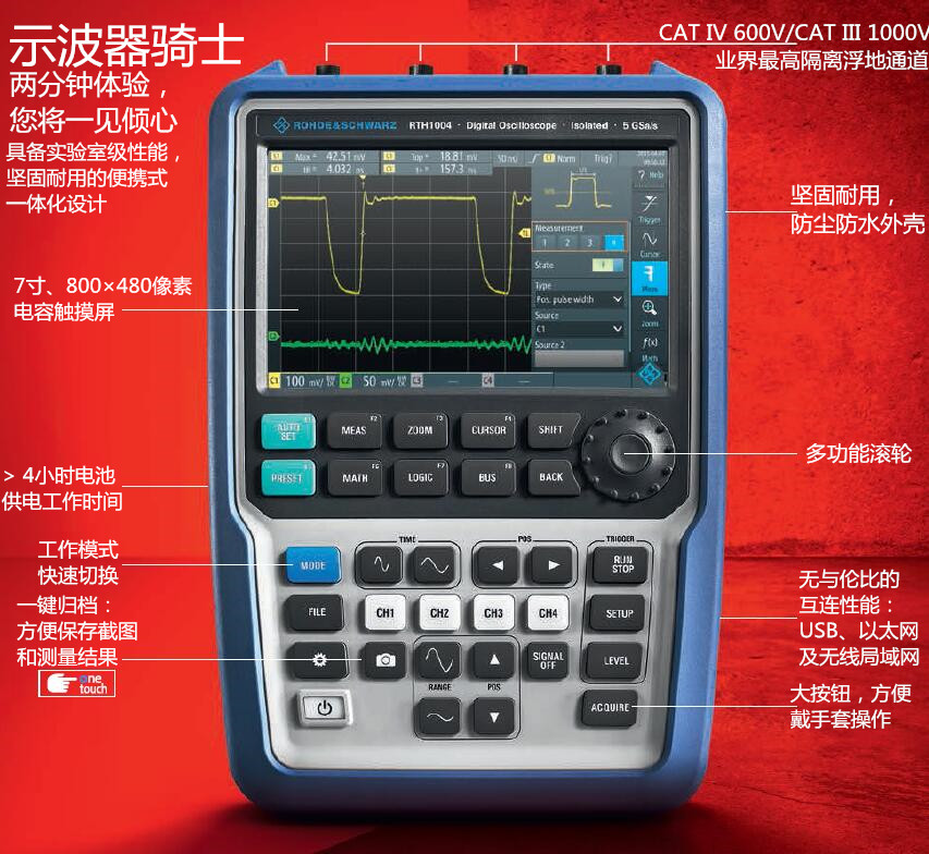 RTH1004四通道隔離示波器騎士把實驗室示波器的功能和性能與電池供電手持設備的形式因素便攜性和耐用性結合起來。其儀器內部集成了邏輯分析儀和先進的測量功能,使它成為了一個通用的測試工具,既可在實驗室進行嵌入式設計調試,也可在外場分析復雜的問題。