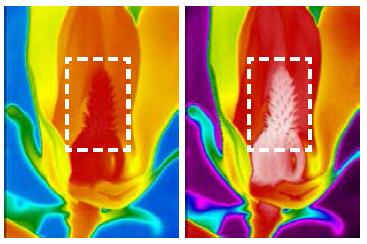 同樣狀況下,下面的右圖所用紅外熱像儀的熱靈敏度更低,畫面清晰顯示花蕊細節的溫度分布,而左圖同區域只能看到一片紅色。