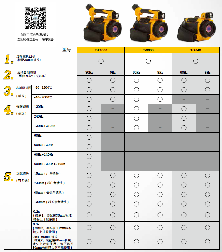 第一步:選擇需要的主機型號,都標配30mm鏡頭。第二步:選擇基礎幀頻,9Hz或30Hz兩種可選。第三步:單選測溫范圍,-40~+1200℃或-40~+2000℃兩種可選。第四步:單選配幀頻,七種可選。第五步:多選需要的鏡頭。詳細搞定見下表: