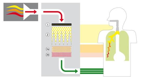 采用4級過濾系統,零排放的保證。①火花保護 LL200V和LL400V;②預過濾面積10sqm;③組合的過濾芯結構:3a)EPA過濾芯E12 EN1822、3b)寬頻段氣體過濾芯 。見下圖: