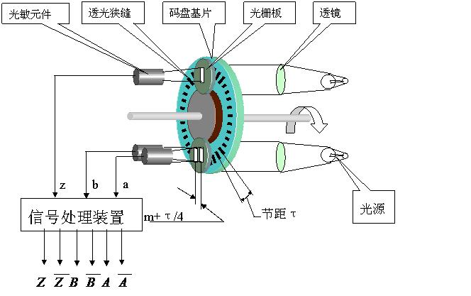 增量式編碼器可利用光電轉(zhuǎn)換原理輸出A、B和Z三組方波脈沖;A、B兩組脈沖相位差90度,能夠判斷出電機的旋轉(zhuǎn)方向,而Z相為每轉(zhuǎn)一圈輸出一個脈沖,用于基準點定位。此編碼器原理構(gòu)造簡單,機械平均,并且壽命可達幾萬小時,具有較強的抗干擾能力,可靠性高。但是是無法輸出軸轉(zhuǎn)動的絕對位置信息。