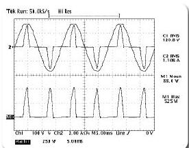 以通訊電源輸入舉例。如下圖所示,通道1為某電路的電壓信號,通道2為其對應的電流,通過泰克的TDS3012C示波器的自動測量功能,分別得到其有效值,為了得到視在功率,我們將測量到的有效值相乘,得到視在功率=120.8V×1.108A=133.8W。為了得到有效功率,我們使用泰克的TDS3012C示波器的數學運算(Math)按鈕,將電壓和電流的波形“逐點”相乘,得到有效功率=88.0W。注意,這里使用的是相乘后的“平均值(Mean)”而不是“有效值(RMS)”來得到有效功率,如前面所敘的平均功率定義。這樣,我們很容易的得到該設備的功率因數PF=88.0W/133.8W=0.66,從而為設計功率校正電路 PFC 提供數據。