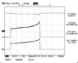 實例 2 :功耗測量 此實例為通過面積測量得到一定時間內的功耗。如下圖所示為測量電池供電設備的功耗曲線,其中通道1為某電路中的電壓,通道2為對應的電流,M1為通道1與通道2相乘的結果,因此M1為逐點相乘的功率。圖中,利用泰克TDS3012C示波器系列的自動測試功能,測得M1的寬度為121秒,面積為57Ws,即為121秒內功耗約為57W。