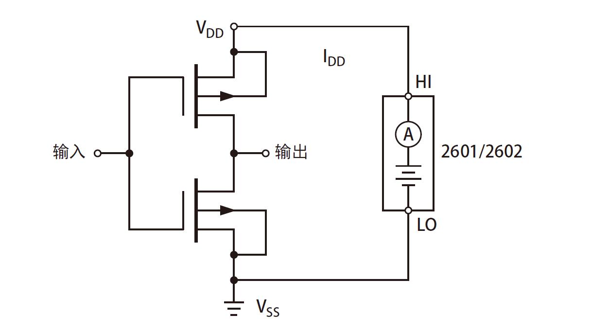 此測試涉及在輸入端處于VDD或VSS并且輸出端未連接時,測量CMOS IC的VDD電源耗電流。圖1是一個CMOS反相器的測試設置框圖。在這個例子中,2601/2602用于源電壓(VDD)并測量產生的靜態電流。