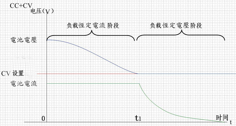 CC+CV模式對(duì)電池放電測(cè)試相當(dāng)簡(jiǎn)便,電子負(fù)載能夠從CC定電流放電模式自動(dòng)切換到CV定電壓模式,不會(huì)讓電池過度放電而損壞,其操作模式圖如下所示: