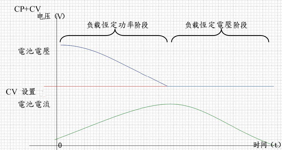 CP+CV模式對(duì)電池放電測(cè)試相當(dāng)簡(jiǎn)便,電子負(fù)載能夠從CP定功率放電模式自動(dòng)切換到CV定電壓模式,不會(huì)讓電池過度放電而損壞,其操作模式圖如下所示: