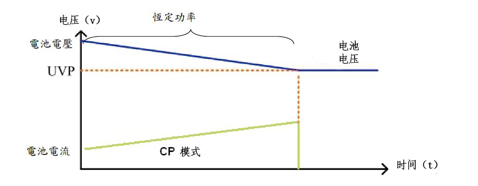 CP+UVP電池放電測(cè)試模式,如下圖使用者設(shè)定電池停止放電的電壓點(diǎn)UVP(undervoltageprotect),測(cè)試時(shí)以固定功率模式(CP)放電,當(dāng)電池電壓小于UVP時(shí)停止放電。