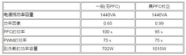 表一是以傳統的整流濾波電路與PFC校正電路的電源供應器之比較,在一個傳統的15A、120V市電電路中,UL規定在15A斷路器之容量下其連續RMS電流值,必須低于12A,才能符合UL的安規要求,因此只有1440VA的容量可使用,于考慮一般的能源轉換效率及差勁的功率因素后,得到僅有702W的功率能轉換到負載上,(1440*0.75*0.65=702W),然而有PFC前端電路之電源供應器,便能提升到1015W的功率轉換到負載上。由此可看出,提升設備功率因素,便能提升用電效率及減少電流諧波干擾,進而減緩對新電廠的需求,對于日益重視環保的趨勢下,確有其意義。