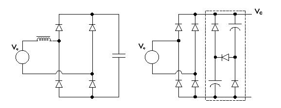 實務上,對于整流性負載之電子、計算機產品,為提高功率因素,可分為被動式及主動式功率因素校正器兩種方式。被動式系使用電感器(如圖二)、電容器(如圖三)所組成的網絡來降低諧波電流,因電源頻率為50或60HZ的低頻,故需體積不小的電感與電容器,另外功率因素提升的效果較差,改良的成果較有限,因此甚少采用。圖二輸入端的電感工作頻率為電源頻率(50/60Hz),因為電感可以抑制電流的突然變化,所以輸入電流的波形會比較平滑。圖三則是利用部份平坦的電路架構,來改善功率因素。其原理乃是延長電源電壓大于輸出電壓的范圍,根據二極管導通的條件,輸入電流的波形將變的較平坦。