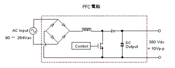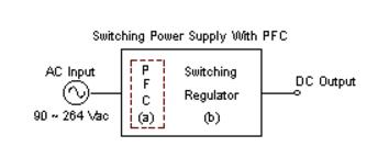 其基本工作原理為調整輸入電流之波形與其輸入電壓波形相同,如此便可達到功率因素為1的目標,目前已有多芯片廠商提供PFC控制IC,僅要外加功率晶體管,電感器等少數外部零件,便可組成一個主動式功率因素調整器,如圖四(b)BOOST結構功因素調整器為升壓型式,即輸入電壓范圍可從90Vdc到264V不需另外開關切換選擇范圍,成為一全球電壓通用的型式,這是功率因素調整器的一項重要附加價值,而功率因素調整器的輸出約為380Vdc內含10Vp-p及(50/60HZ漣波及高頻噪聲)的成份信號。