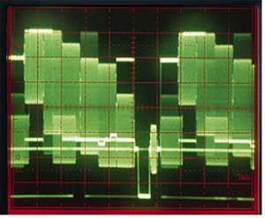 圖2-1給出了使用模擬示波器顯示全電視信號的情況,請注意其中豐富的波形細節和亮度變化的情況。圖2-2給出了使用數字存儲示波器顯示全電視信號的情況。圖2-3給出了使用數字熒光示波器顯示全電視信號的情況。雖然存儲深度加大,采樣率提高,波形捕獲率提高,還是沒能像模擬示波器一樣提供亮度等級等信息,但比起數字存儲示波器已經進步很多。