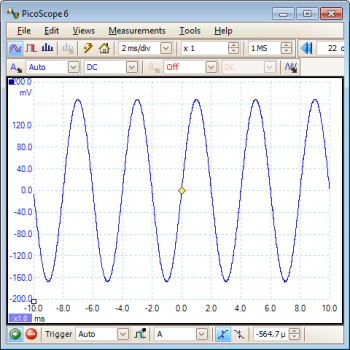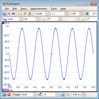 下面分別描述典型的8位、12位和16位不同PicoScope示波器的時域和頻域顯示。信號源是在一個Android智能手機上運行的FuncGen程序,產生了一個250Hz正弦波,最大幅度為170mV。