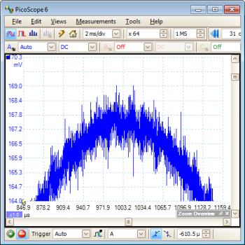 一臺8位PicoScope示波器(例如2206B型)給出了一個足夠好的視覺來顯示波形,如圖1所示。該波的頻率和振幅,可以合理的精度測量。但是,放大64倍后(圖2)顯示了8位分辨率的限制。