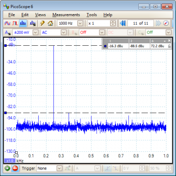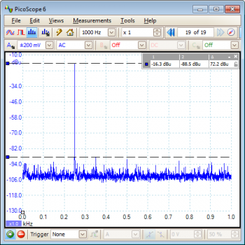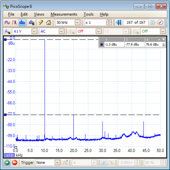 同一信號由一臺12位PicoScope示波器(例如4424型)捕獲,在正常范圍視圖中看起來相同,如圖13所示。放大64倍后(圖14),看上去比8位示波器更清晰,視覺上具有非常小的噪聲和數字化臺階。在頻譜視圖中(圖15),本底噪聲現在低到足以顯示一些諧波和其它雜散信號,達到約76dB低于10KHz峰值。在這個階段,我們不知道它們否是由示波器還是信號發生器導致。
