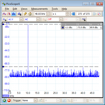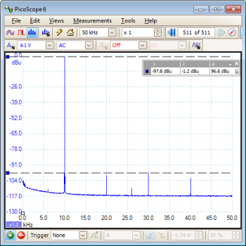 在該測試中,我們使用用PicoScope4262型示波器/音頻分析儀內置得低失真信號發生器取代低成本的信號發生器。這樣,我們能夠測試顯示在PicoScope4262前端具有具有非常低的失真所帶來的好處。該發生器設置為10kHz正弦波,其幅度為990mV。