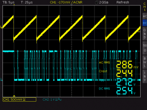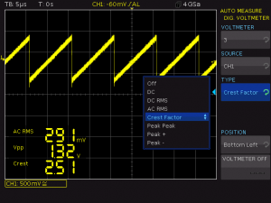 現(xiàn)在有些示波器內(nèi)置毫伏表(DVM)功能,例如HMO3034、HMO3054和HMO1002示波器,示波器內(nèi)置毫伏表一般能測(cè)量直流電壓(DC)、交流真有效值電壓(ACrms)、波峰因素、峰峰值電壓(Vpp)、正向峰值電壓(Vp+)、負(fù)向峰值電壓(Vp-),并且能多位顯示和多通道測(cè)量(圖1),這樣很多地方擁有了具有毫伏表功能的此類示波器,就不需要購(gòu)買毫伏表或電壓表了,例如高校電工電子教學(xué)。