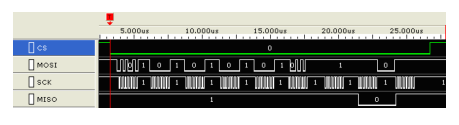 一般的示波器只有兩路通道輸入,對于需要多個通道輸入的測量(如常用的SPI、SSI、Microwire等)就顯得無能為力了,但邏輯分析儀一般都有16個通道以上的輸入,可以輕松應付多通道輸入的測量。SPI通訊通常由CS,SCK,SI,SO四個信號組成,SPI接口的芯片應用廣泛,有E2PROM,I/O擴展,復位芯片,USB接口等,在日常電子產品設計中使用非常廣泛。圖1.4為使用邏輯分析儀對SPI總線進行測量的結果。