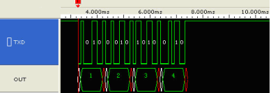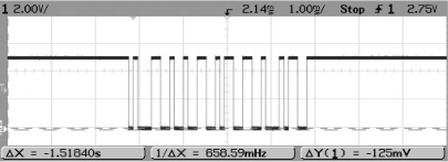 示波器的分析功能只是針對輸入通道進行頻率、占空比、峰峰值等單一的通道進行測量。而邏輯分析儀則可以針對一個或多個輸入通道進行時序和狀態的分析。對于單片機UART發出的數據,使用示波器和邏輯分析儀都可以對其進行測量,如圖 1.7為示波器測量的結果,可以觀測到UART的高低電平時間,但數據是什么就無從而知了。