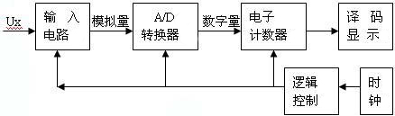數字直流電壓表A/D轉換器將隨時間連續變化的模擬電壓量變換成數字量,再由電子計數器對數字量進行計數得到測量結果,再由譯碼顯示電路將測量結果顯示出來。邏輯控制電路控制電路的協調工作,在時鐘的作用下按順序完成整個測量過程。根據采用的A/D轉換方式可分為積分式和非積分式,現以雙斜積分式為例介紹直流電壓表的工作原理。