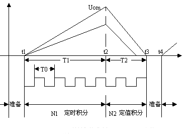 (2)采樣階段(t1——t2):設被測電壓Ux為負電壓。t=t1時,S4斷開S1閉合,積分器對Ux積分,U0從零開始線性上升,同時閘門被打開,計數器的計數容量為N1,當計數器的值達到N1+1時,計此時刻為t2,計數器溢出,產生一個進位脈沖給邏輯控制電路,控制開關S1斷開。t=t2時: