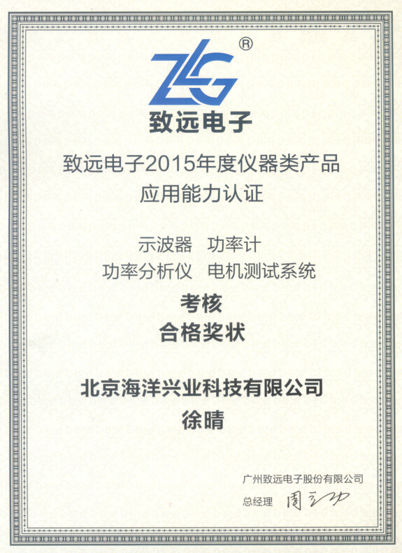 2015年8月,北京海洋興業(yè)科技有限公司(簡稱海洋儀器)與廣州致遠電子有限公司(簡稱致遠電子)合作,成為PA300系列功率計北方平臺。同時于8月3日至7日,海洋儀器產(chǎn)品開發(fā)部的技術(shù)工程師到廣州致遠電子參加了為期5天的儀器類產(chǎn)品培訓(xùn),并順利通過考核取得合格證書。