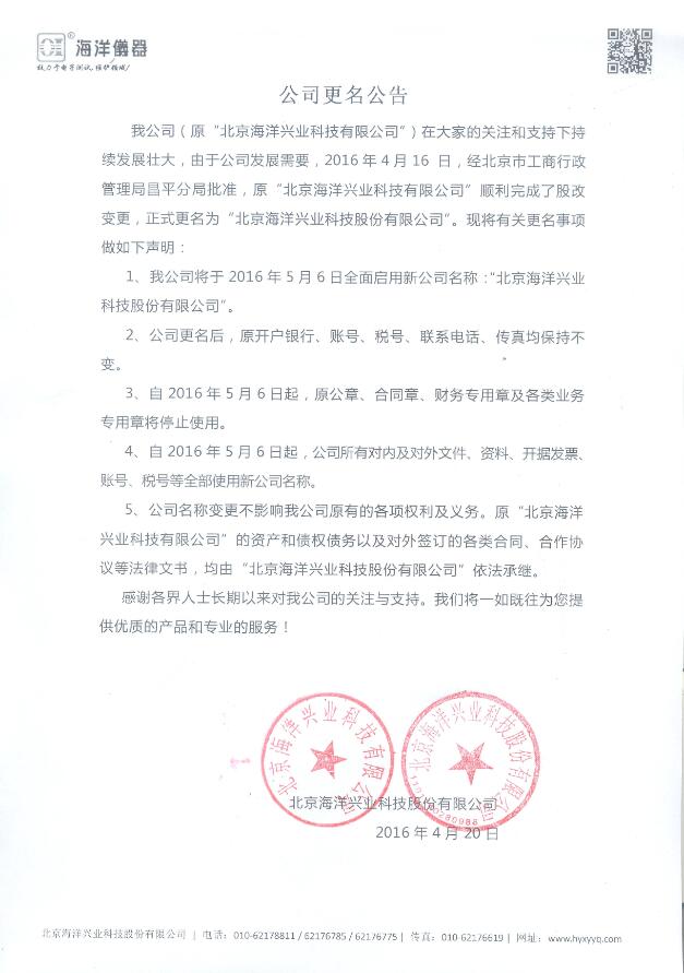 我公司(原“北京海洋興業科技有限公司”)在大家的關注和支持下持續發展壯大,由于公司發展需要,2016年4月16 日,經北京市工商行政管理局昌平分局批準,原“北京海洋興業科技有限公司”順利完成了股改變更,正式更名為“北京海洋興業科技股份有限公司”。現將有關更名事項做如下聲明: